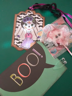 También use troqueles de big shot con motivos de Halloween, unos sellos con troqueles de Tim Holtz. Use unos papeles de Tiger.
